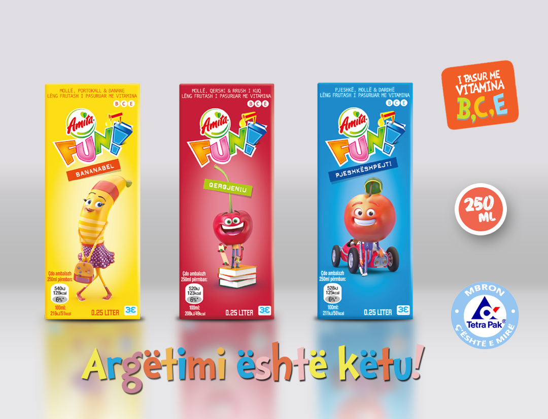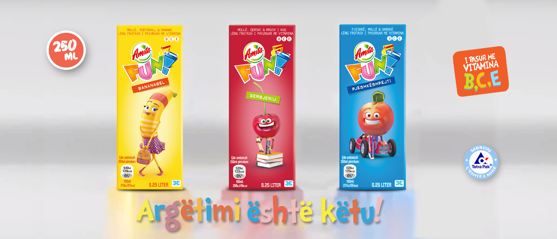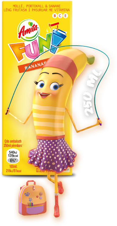 LËNGJET AMITA FUN SIGUROJNË MËNYRËN MË TË SHIJSHME DHE TË KËNDSHME PËR FËMIJËT PËR TË MËSUAR RRETH SHIJEVE TË FRUTAVE DHE T'I PËRFSHIJNË ATO NË DIETËN E TYRE TË PËRDITSHME. HERONJTË E AMITA FUN, TË PARAQITURA EDHE NË PAKETIMIN E TYRE, QUHEN: BANANABEL, PJESHKËSHPEJTI, QERGJENIU.